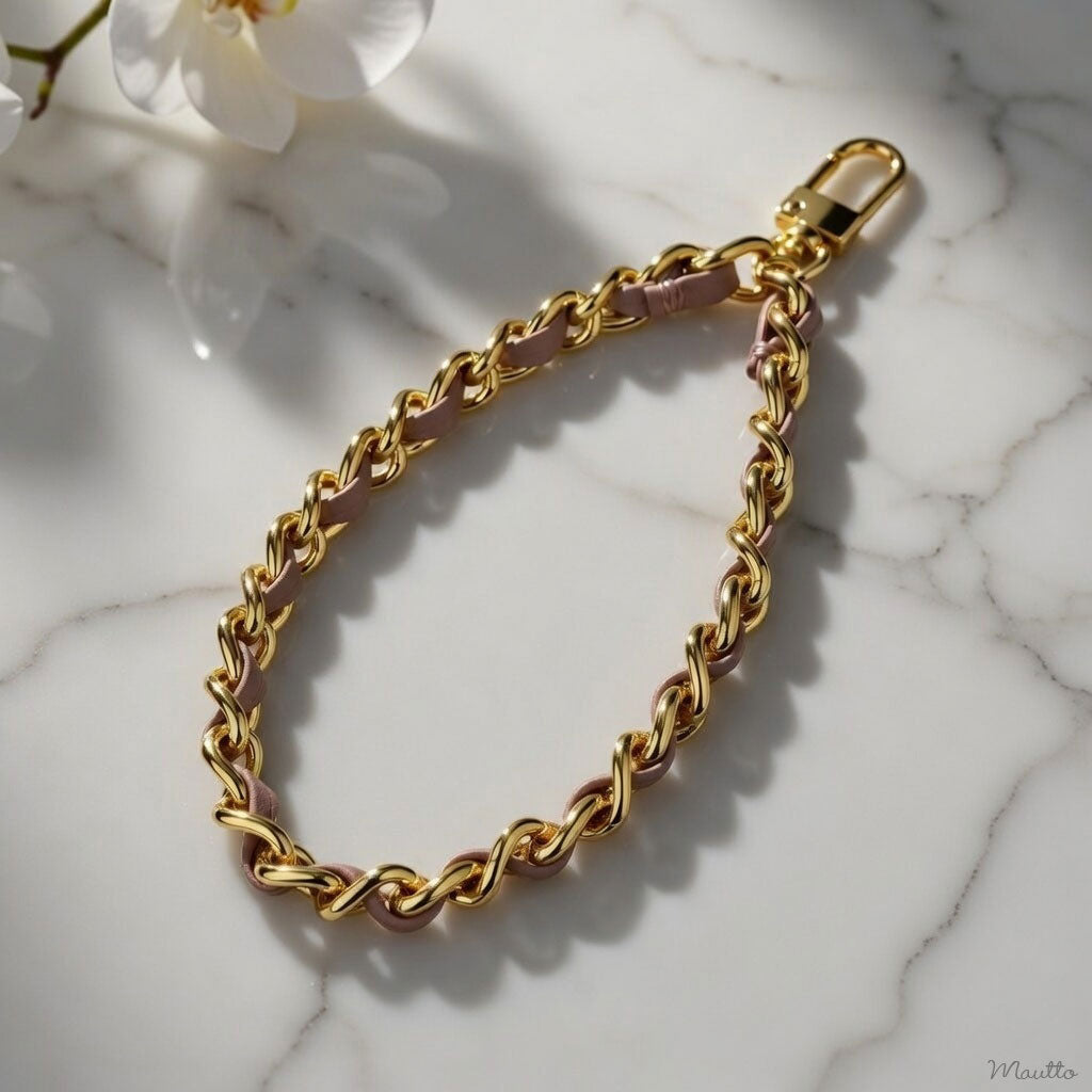 Ultra luxurious chain wrist strap with leather woven-in by hand. Available in gold-tone, silver-tone and gunmetal black finishes.