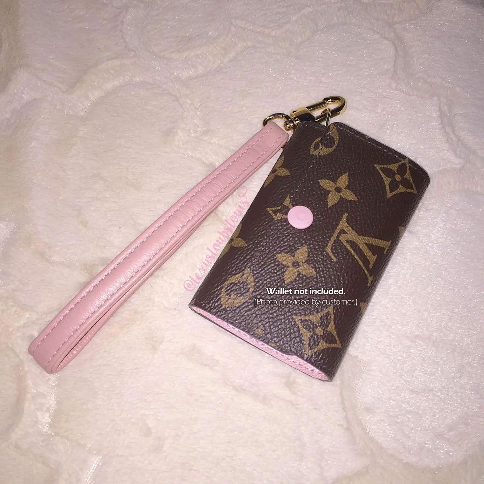 Primary photo shows Pink Blush leather wrist strap on a customer's wallet; wallet/bag not included.