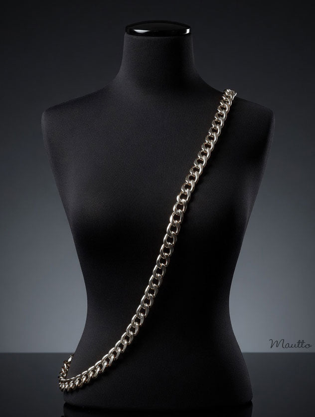 Large Flat Classy Curb silver chain strap shown on mannequin. 50 inch length shown.