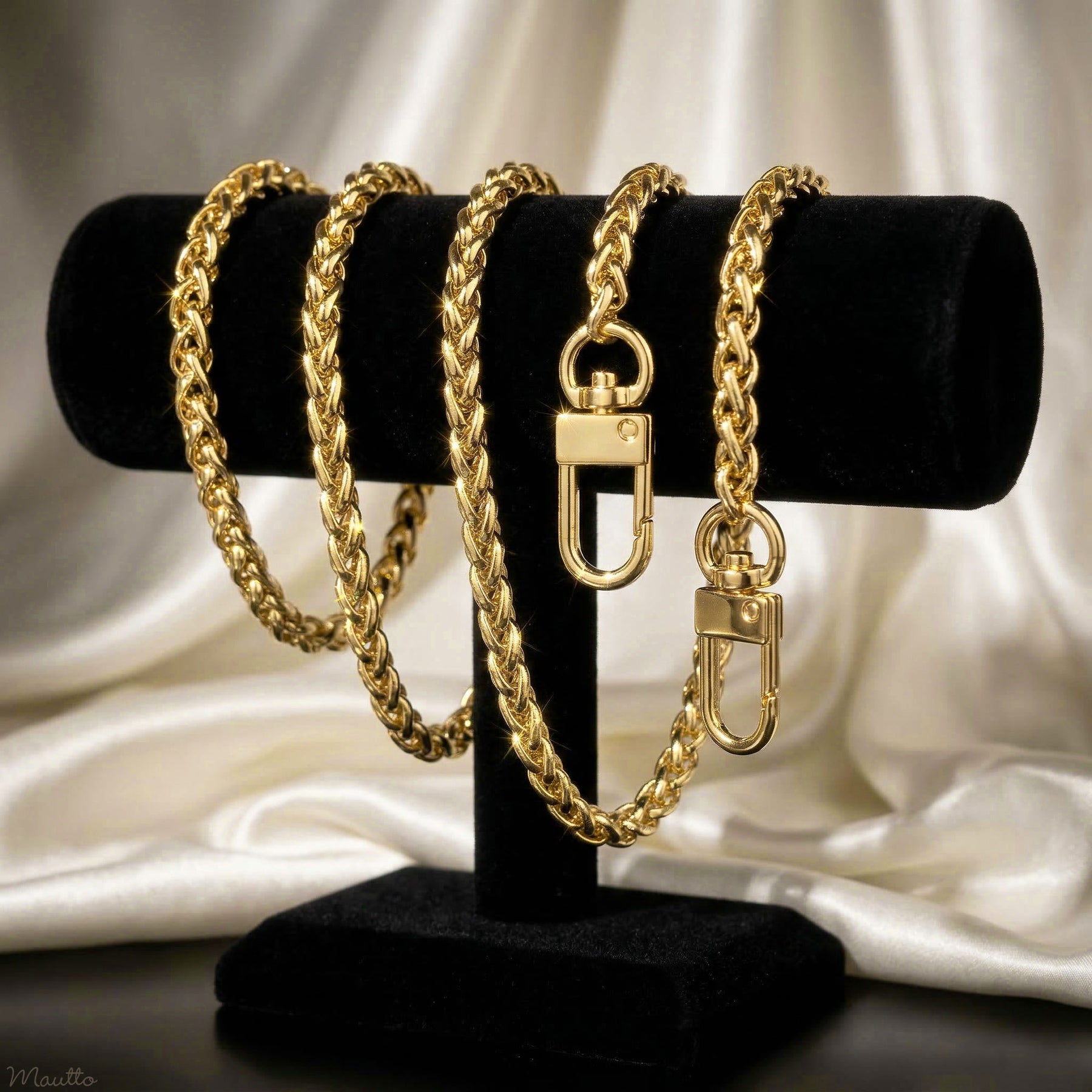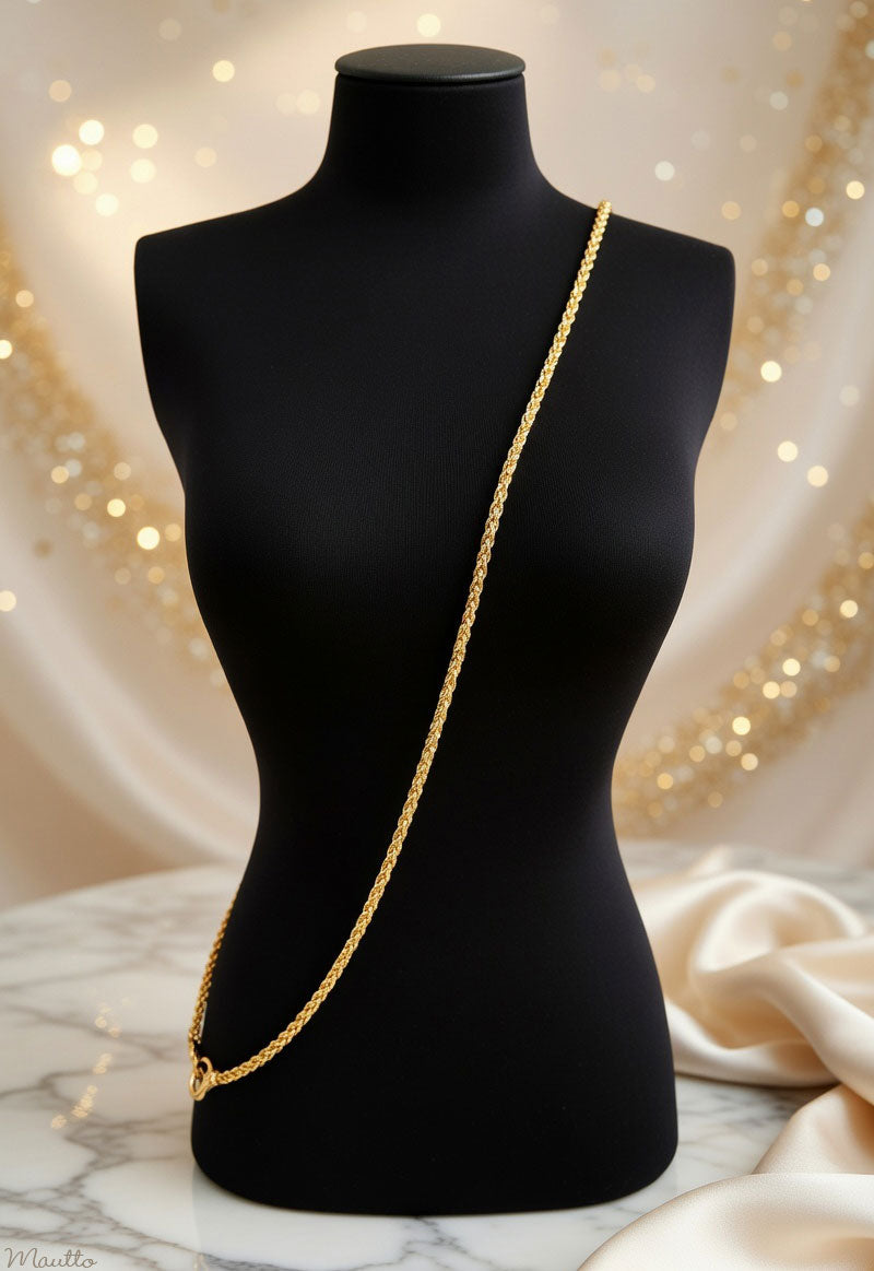 Regular price €31,95Luxurious polished gold-tone chain strap featuring an elegant braided "wheat" design, consisting of multiple interlocking twisted links that form a round-shaped braid. The traditional yellow gold-tone finish, offers an elegant/formal look, which pairs well with many bag colors, or, bags with gold-tone hardware. Suitable for petite, small or medium size bags, purses, SLGs, wallets and more.