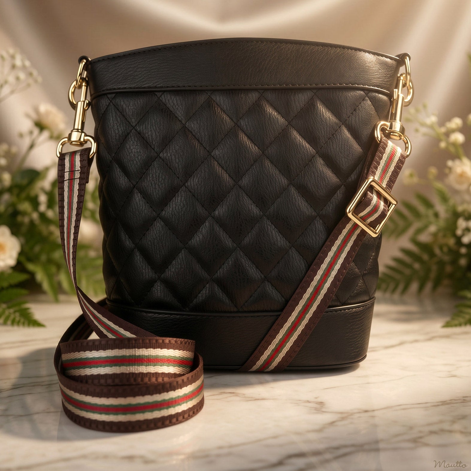 Photo of Brown-Beige-Green-Red striped strap on a small handbag.