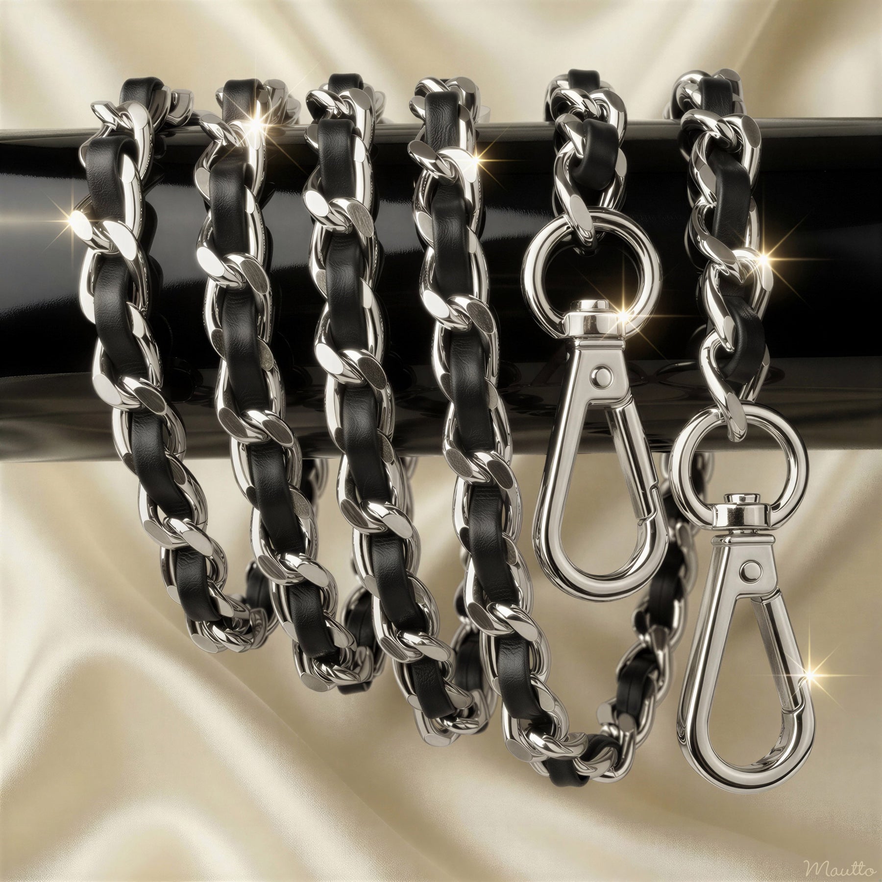 Regular price 406,00 krPremium polished silver-tone chain strap featuring the classic Curb link design with diamond cut accents and leather hand-woven through. The highly polished links with diamond cut accents reflect light beautifully. This popular design provides a fashionable and elegant look, often seen on designer handbags (Chanel, Kate Spade, Marc Jacobs, for example).