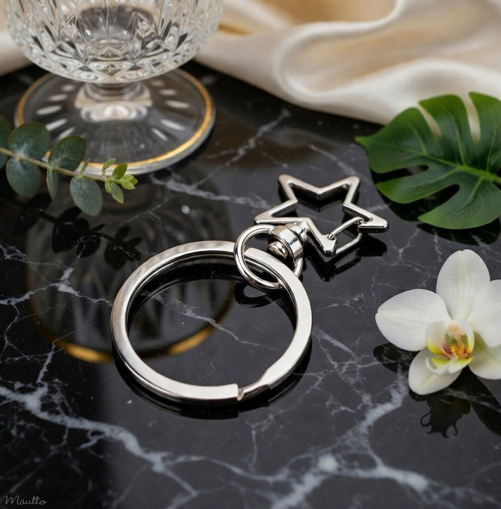 Shine bright with this elegant star-shaped keyring accessory! Featuring a fancy star-shaped clip with a smooth swiveling base and attached keyring, this accessory is perfect for adding a little sparkle to your day. Choose from a polished gold or silver finish and clip it to your purse, keys, backpack, or anything else that could use a pop of personality and charm.