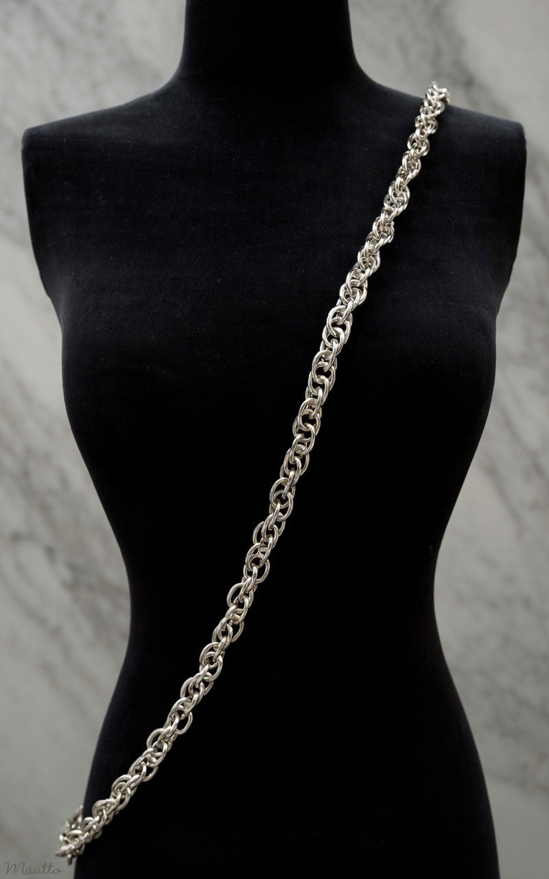 Regular price 335.00 krLuxurious polished silver-tone chain strap in the Prince of Wales design, consisting of rounded oval links that form a classy twisted look. The traditional chrome silver-tone finish, offers an elegant/formal look, which pairs well with many bag colors, or, bags with silver-tone hardware. This is one of the strongest chains available and designed for bags of all sizes.