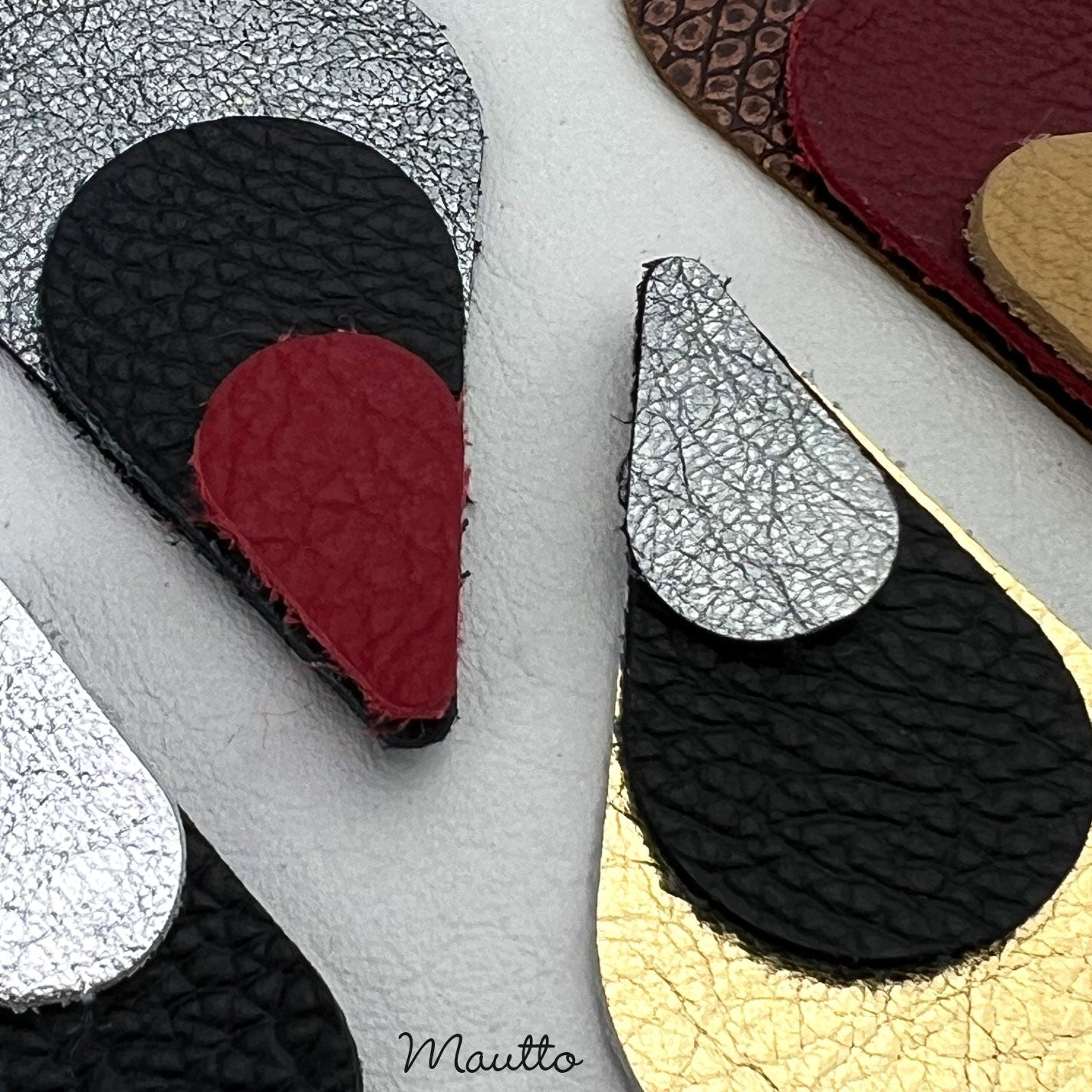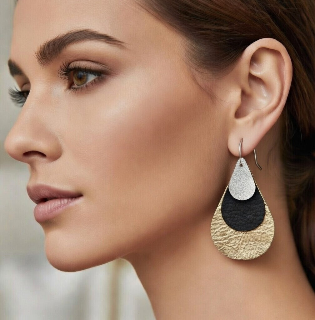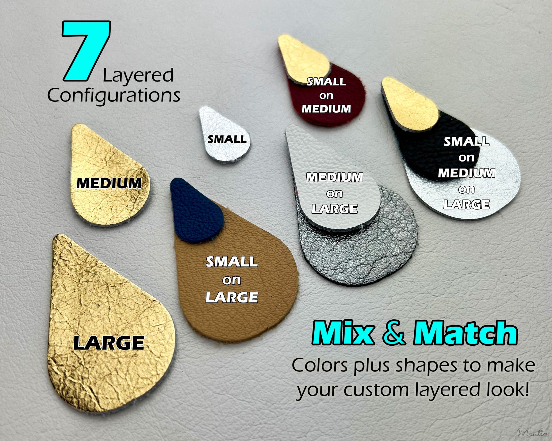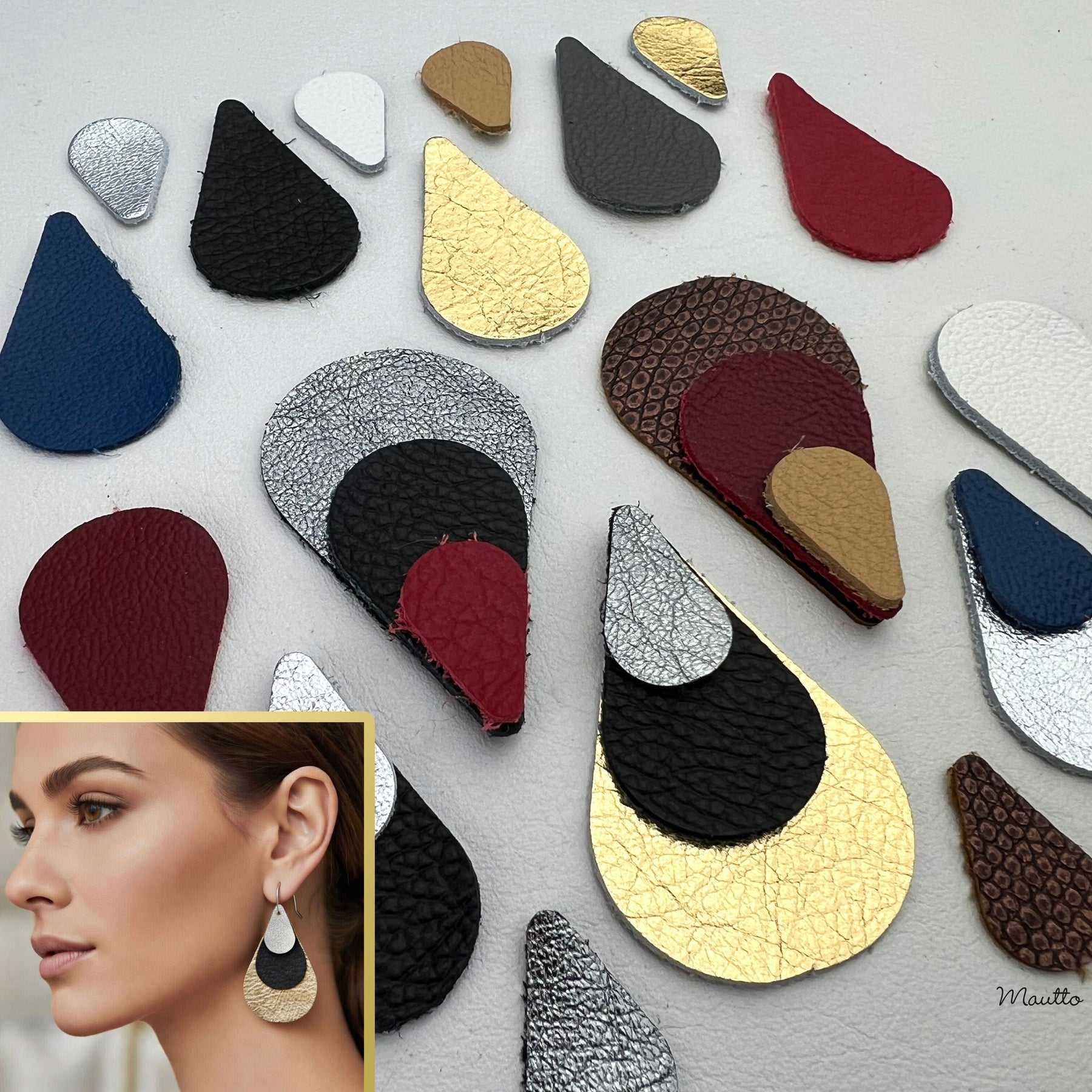 Create your own stunning layered leather drop earrings. Design bold, modern statement earrings with this DIY leather earring kit featuring pre-cut teardrop shapes in a mix of colors and sizes, from metallic gold, silver, classic black, deep red, navy, brown embossed, and more.