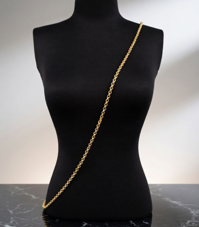 Regular price $37.00Premium polished gold-tone chain strap featuring the popular and classic Rolo design. The round shaped, highly polished links reflect light beautifully. This chain's design and weight allow it to be used nicely as a handle, shoulder or across-the-body ("cross body") strap.